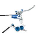 Nouveauté 2022, le frein Hope Tech 4 offre importante une augmentation de puissance par rapport au Tech 3. Il est ici doté d'un étrier V4 (4 pistons) qui développe une énorme puissance de freinage. Parfaitement adapté au E-Bike et à la DH il est ici proposé en couleur Argent / Bleu