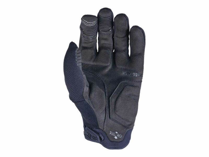 Le dessus du gant est fabriqué en Spandex®, un matériau extensible qui épouse parfaitement la forme de la main. La construction FIVE ErgoFit™, avec ses micro-fourchettes en Lycra® Stretch, assure une totale liberté de mouvement. La paume en AX Suede® Cinco est équipée d’impressions en silicone sur l'index, le majeur et le pouce afin d’offrir un grip optimal sur les leviers et les commandes de votre machine.